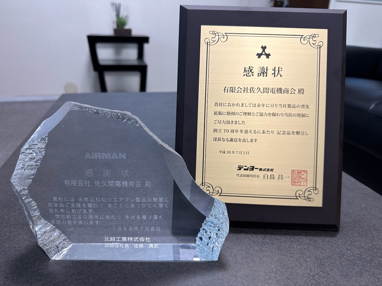 今回いただいた記念品も大切に入口のカウンターに飾らせていただきました。